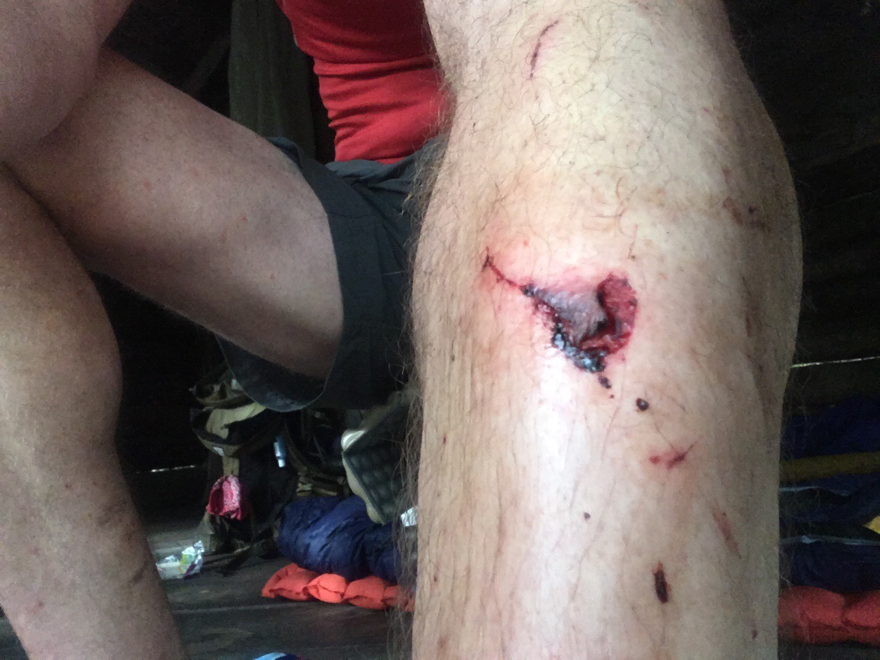 I hit my shin on a stump today and cut it pretty good. This is after I cleaned it and before I put the bandage on.
